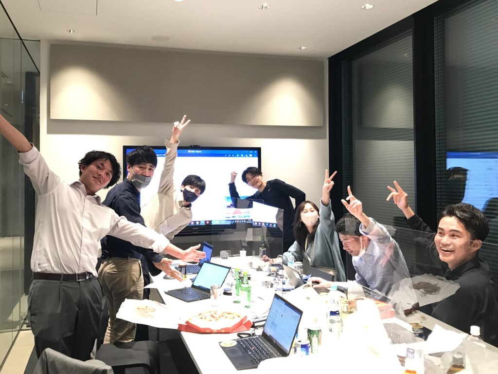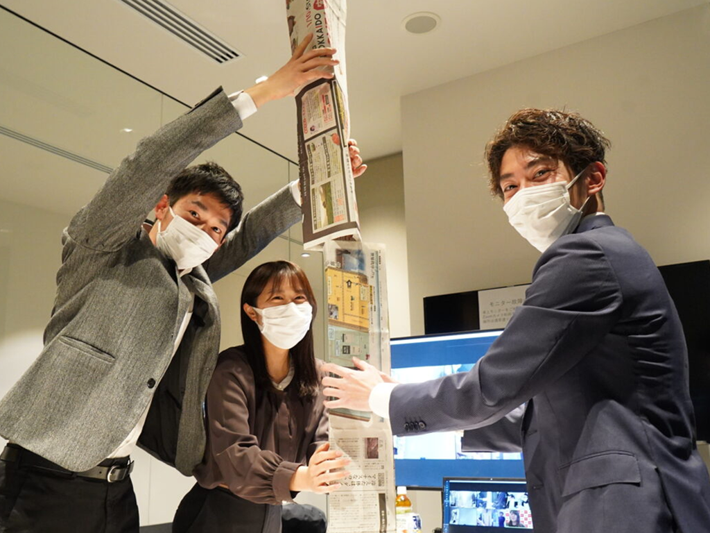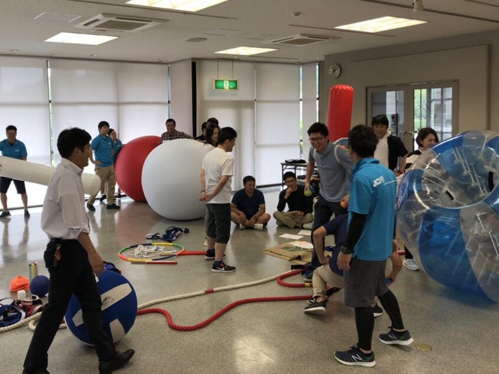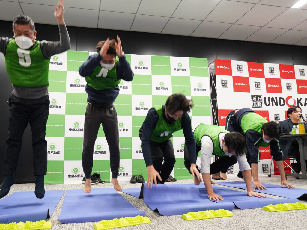 およそ200名の従業員の皆様が部署ごとに会議室に集まり、関西や札幌のオンライン参加チームを合わせて、44チームをオンラインでつなぐ運動会を実施しました。大会議室では実際に競技も行われ、役員の皆様も参加。普段見られない一面を見せることで、場が和やかになりました。アンケートでは「普段話さない人との交流が生まれた」といった声が寄せられ、目的であった社内の一体感や心理的安全性の醸成にも成功しました。