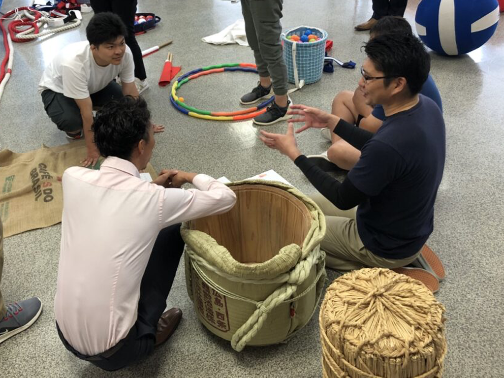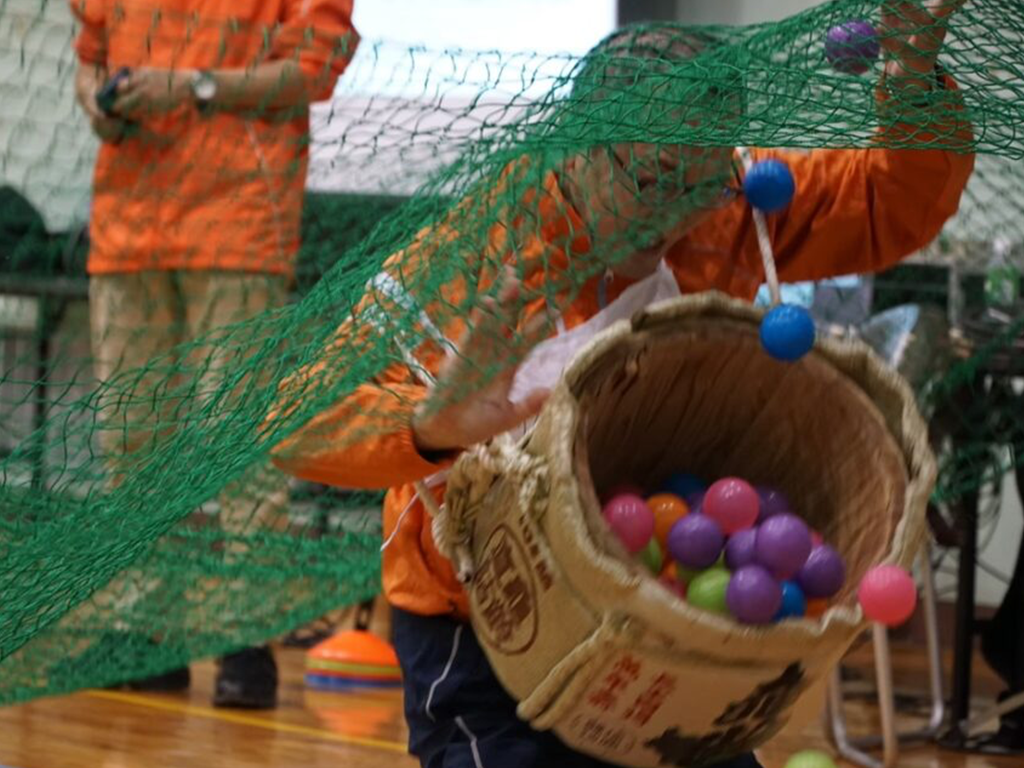 運動会の競技を開発する「運動会ハッカソン」を行いました。チームに分かれ、玉入れや、大玉など、定番競技の道具を使って様々なアイディアを出し合います。酒樽を運ぶ障害物レースなど、地元文化を取り入れたユニークな種目が誕生。「チームの力になることができ、嬉しかった」「自分では思いつかない意見が聞けた」など、考案から実際の競技まで体験することで、参加者同士の一体感が高まり、コミュニケーションやチームワークの向上につながりました。