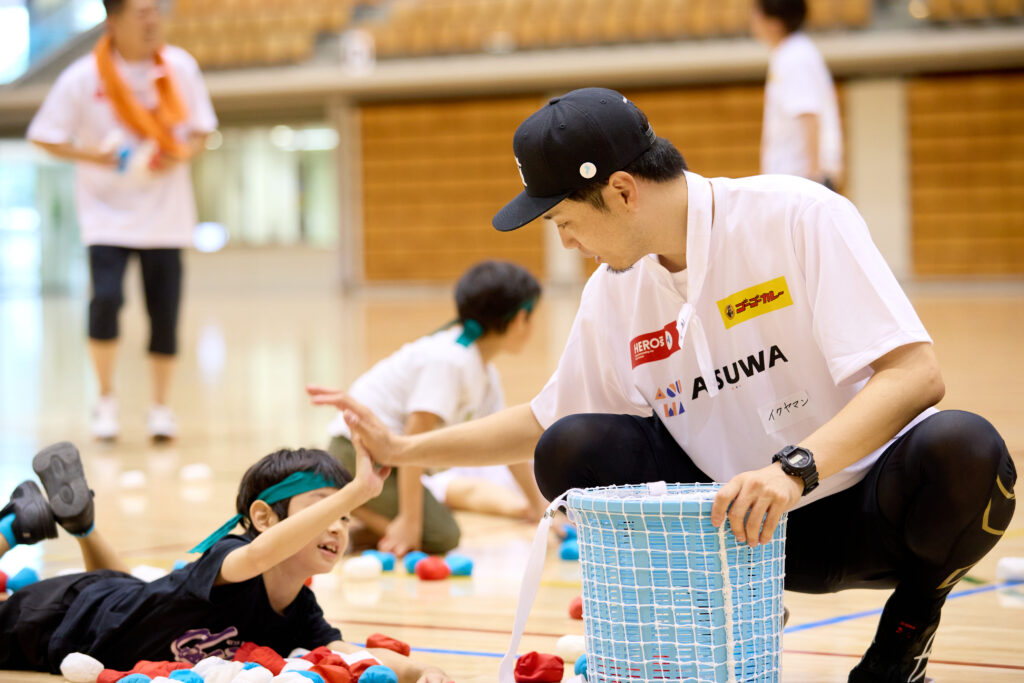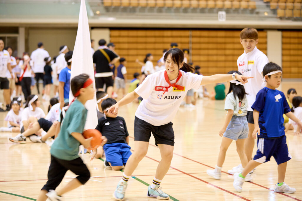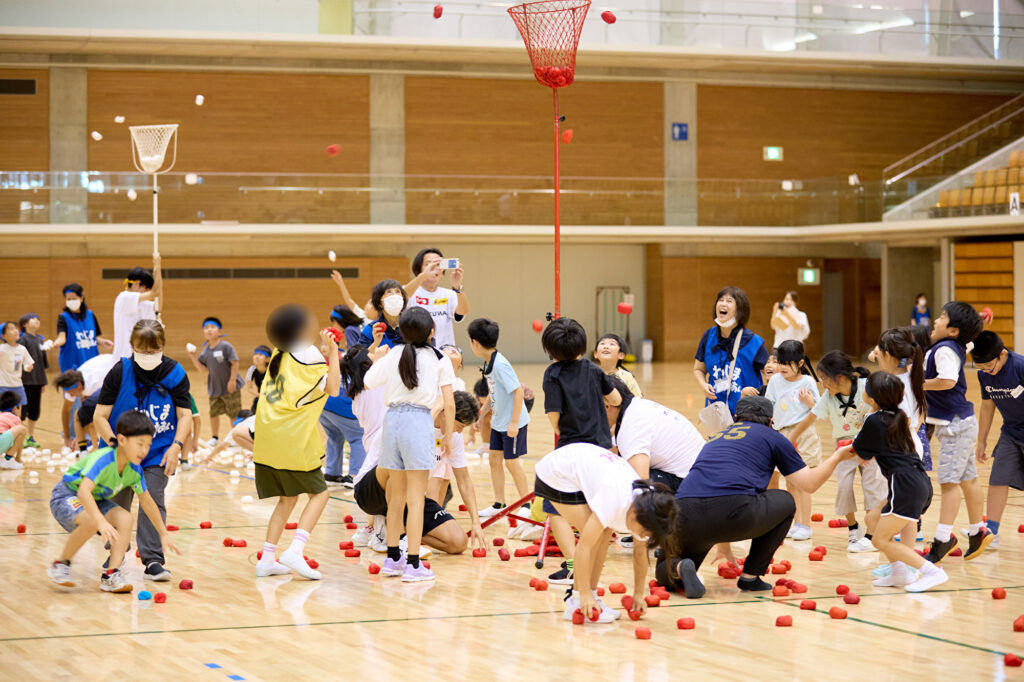 当日は、現役Jリーガーや元プロ野球選手やラグビー元日本代表、オリンピックソフトボール金メダリストなど、14名のアスリートと150名の子どもたちが参加し、体育館いっぱいに歓声が響き渡りました